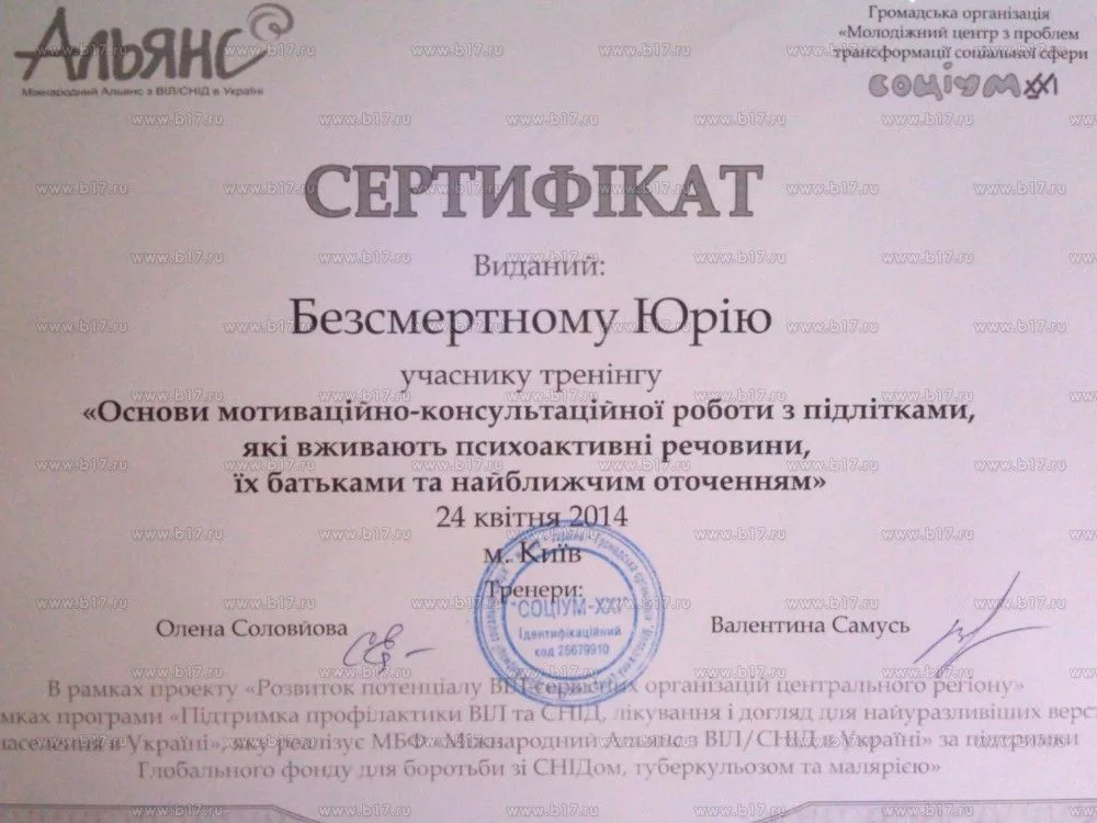 Выдан: ГО "Інститут проблем наркоманій та наркозлочинності"